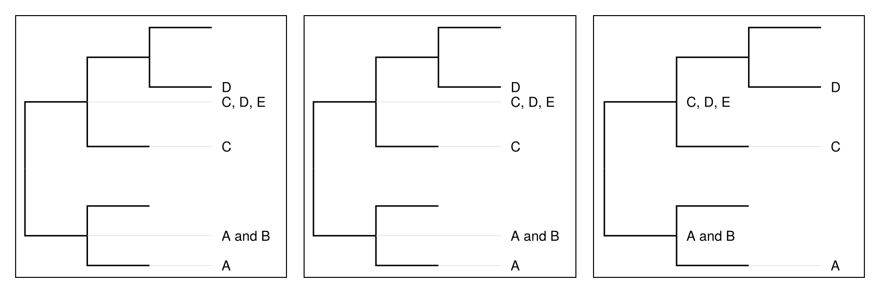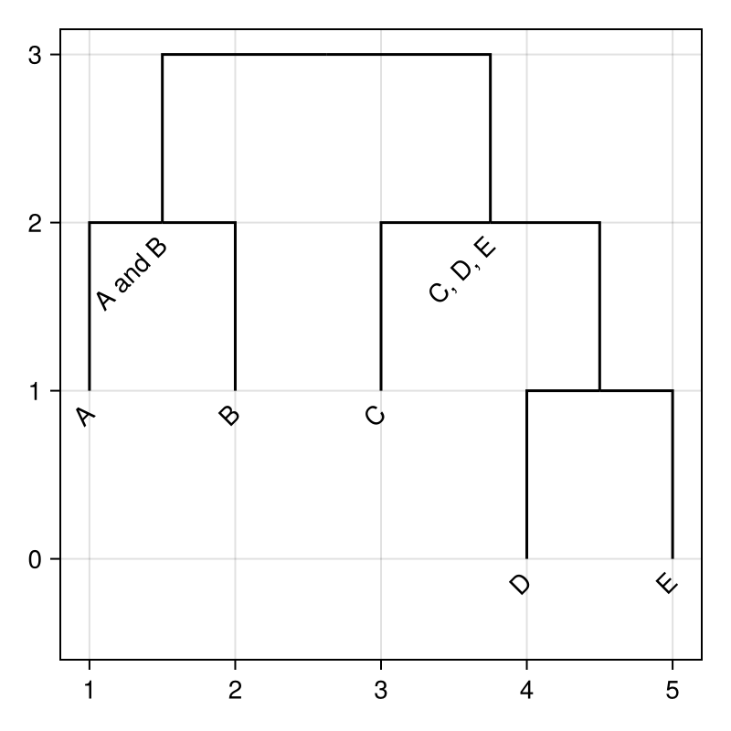 nodelabels = [tree[1] => "A and B", (:c, (:d, :e)) => "C, D, E", :a => "A", :c => "C", :d => "D"]