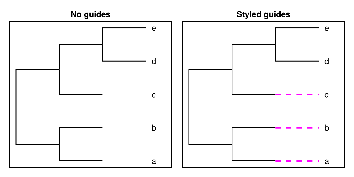 ax, tp = treeplot(fig[1,2], tree; axis=(;title="Styled guides", xautolimitmargin=(0.05, 0.2)))