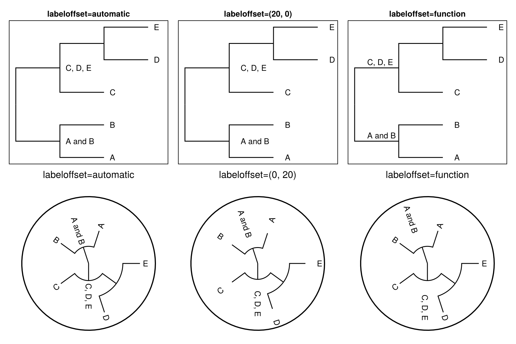 labeloffset = automatic — Offset in pixel space to push text label anchor points. Available options: automatic (default) if plotting on Axis() the offset is (5px, 0), if on PolarAxis() the default is 5px * (cos(θ), sin(θ)) where θ is the radian angle of the node. labeloffset::Real defaults to offsetting the label in pixels toward the x direction for Axisand in radius forPolarAxislabeloffset=Tuple{<:Real, <:Real}, if plotting on anAxisprovide(x,y), if onPolarAxisprovide(θ, r)in pixel units for the offset relative to the label anchorpoint.labeloffset::Function=(node,pos)->(x px, y px), Provide a custom function that takes a node and its coordinate in dataspace and return a pixel space offset. Note that pixel space does not get converted like thePolarAxis, so conversion of coordinates may be requiredroff * (cos(θ+θoff), sin(θ+θ_off))`.